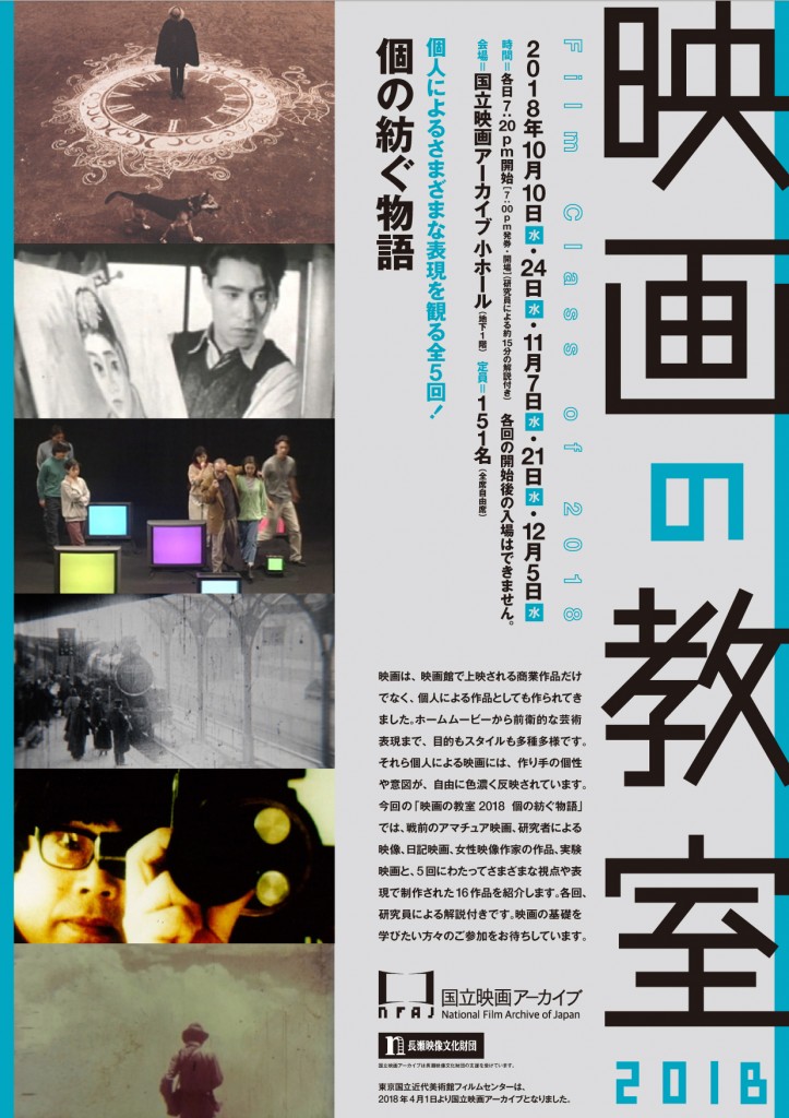 映画は、映画館で上映される商業作品だけでなく、個人による作品としても作られてきました。ホームムービーから前衛的な芸術表現まで、目的もスタイルも多種多様です。それら個人による映画には、作り手の個性や意図が、自由に色濃く反映されています。今回の「映画の教室 2018 個の紡ぐ物語」では、戦前のアマチュア映画、研究者による映像、日記映画、女性映像作家の作品、実験映画と、5回にわたってさまざまな視点や表現で制作された16作品を紹介します。各回、研究員による解説付きです。映画の基礎を学びたい方々のご参加をお待ちしています。