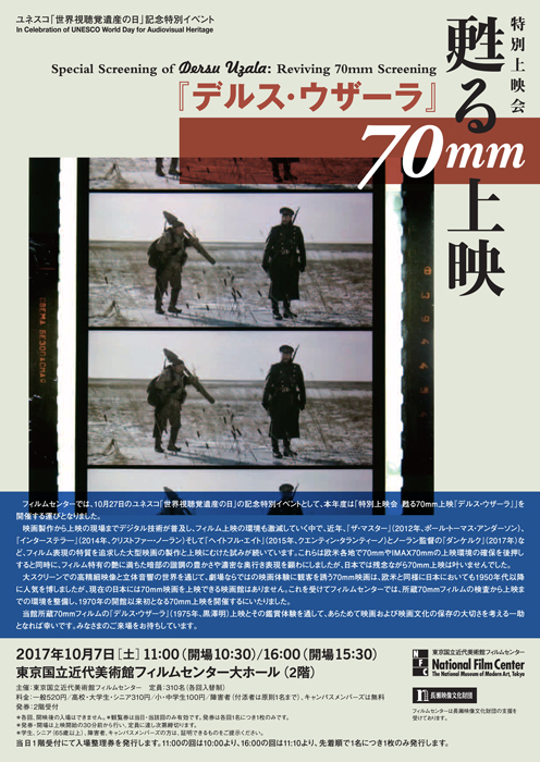 フィルムセンターでは、10月27日のユネスコ「世界視聴覚遺産の日」の記念特別イベントとして、本年度は「特別上映会 甦る70mm上映『デルス・ウザーラ』」を開催する運びとなりました。