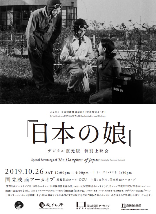 国立映画アーカイブでは、本年のユネスコ「世界視聴覚遺産の日」(10月27日)記念特別イベントとして、日メコン交流年2019と来年のミャンマー映画生誕100年を祝し、日本とミャンマー(当時ビルマ)初の合作映画『日本の娘』(1935年、監督:ニープ、共同監督:枝正義郎 他)のデジタル復元版プレミア上映とトークイベントを開催します。映画遺産とともに両国の文化や歴史を改めて顧みる本イベントに、みなさまのご来場をお待ちしています。