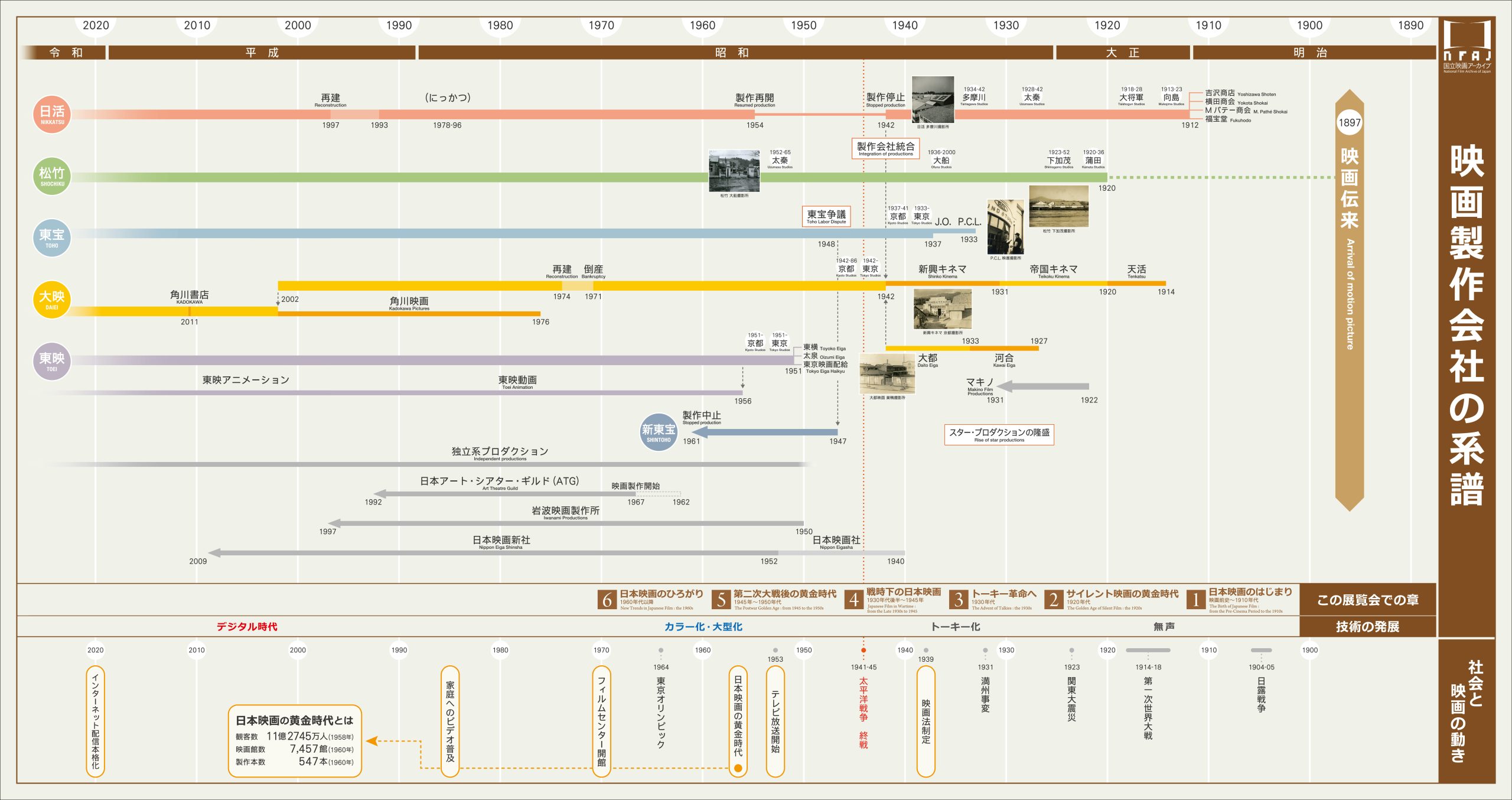 - ※常設展の入口に掲示しております日本の「映画製作会社の系譜」パネルは下の画像からも拡大してご覧いただけます。