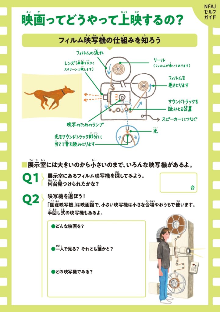 常設展「日本映画の歴史」では、中学生以下の来館者の方々に4種類のセルフガイドを配布しています。セルフガイド「日本映画の歴史」では、展示品についてのクイズを解きながら、“映画大国にっぽん”の歴史をたどることができます。書き込み式のセルフガイド「映画ってどうやって撮るの?」「どんな動物がいるかな?」「映画ってどうやって上映するの?」もございます。映画の歴史を作ってきたカメラや映写機、映画やポスターなどに潜んでいる動物たちを展示室で探してみてください。休み期間中の自由研究にも最適です!