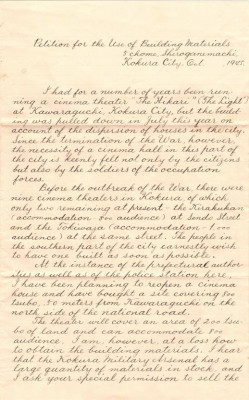 映画興行主中村上から占領軍への映画館建設物資使用の陳情書(1945年)