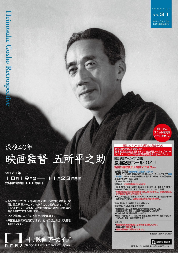 本特集は、五所の没後40年という節目の年に、現存する最古の監督作品『マダムと女房』から遺作『わが街三島 1977年の証言』まで、計36本(33プログラム)の監督作と、五所の姿をとらえた3本の作品を上映する大規模な回顧特集です。当館ではフィルムセンター時代の1974年に開催した「五所平之助監督特集」以来、47年ぶりの特集となります。人間のたくましさも弱さも等しくとらえ続けた五所作品を通して、日本社会を生きる人々の等身大の姿があらためて浮かび上がってくることでしょう。皆様のご来場を心よりお待ち申し上げます。
