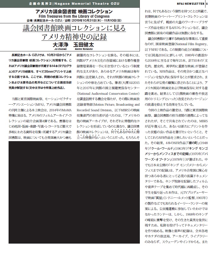 現在発売中の『NFAJニューズレター』第7号(2019年10月-12月号)に掲載されている、大澤浄/玉田健太「議会図書館映画コレクションにみるアメリカ精神史の記録」をPDFファイルで公開しました。こちらからどうぞ。