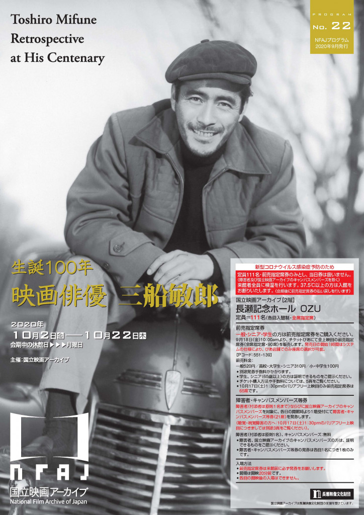 本企画は、三船敏郎の生誕100年を記念して、『銀嶺の果て』から最後の出演作『深い河』(1993)まで計27作品(27プログラム)によって、その偉大な足跡を回顧します。映画ファンの皆様のご来場をお待ち申し上げます。