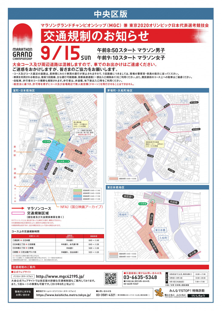 9/15(日)は9:00amごろから11:30amごろまで、マラソングランドチャンピオンシップ(MGC)兼 東京2020オリンピック日本代表選考競技会の開催により、当館の周辺でも車道交通規制が行われます。ご来館を予定されている方は、お時間に余裕をもってお越しください。