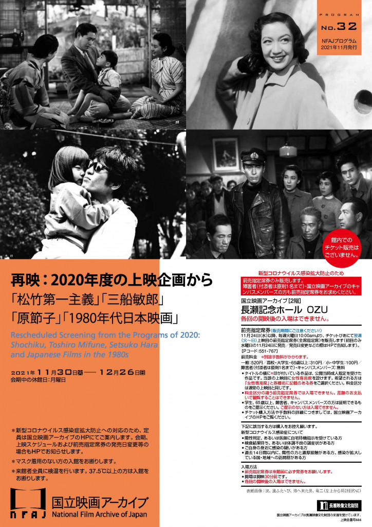 新型コロナウイルス感染症対策により定員を減らして上映した昨年度の企画「松竹第一主義 松竹映画の100年」、「生誕100年 映画俳優 三船敏郎」、「生誕100年 映画女優 原節子」で完売となった作品、「1980年代日本映画――試行と新生」で臨時休館に伴い上映中止となった作品の中から32プログラム(33本)を追加上映します。皆様のご来場をお待ち申し上げます。