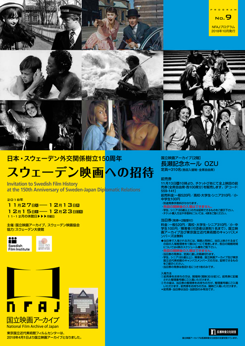 本特集では、ベルイマン作品や同国出身の女優イングリッド・バーグマンの出演作品はもちろん、スウェーデン国民が愛した大衆喜劇やメロドラマ、スウェーデン映画史上の重要作、また、ボー・ヴィーデルベリやヤーン・トロエルら1960年代に台頭した新世代の映画作家たちによる革新的作品など、日本未紹介の作品を多数含む、1934年から1982年までにわたる計30本(24プログラム)のスウェーデン映画を上映します。これほど時代や監督、ジャンルのバラエティに富んだスウェーデン映画特集は過去に類を見ず、スウェーデン映画の歴史を体系的に知ることができる絶好の機会になるでしょう。さらにスウェーデン皇太子の貴重な訪日記録映画も加え、ぜひお見逃しなきよう、皆さまのご来館をお待ち申し上げます。