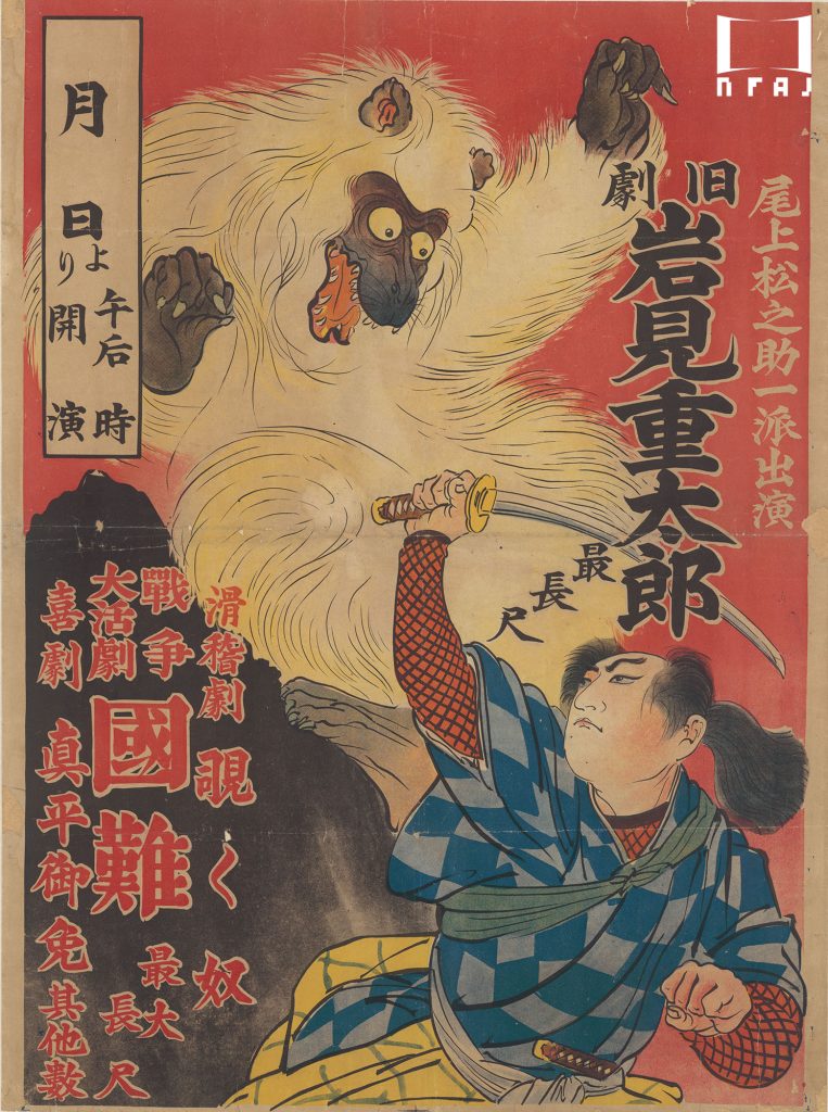 尾上松之助の狒々退治が売り物だった武勇伝もの。松之助の八面六臂の活躍がポスター上でも表現されている。
