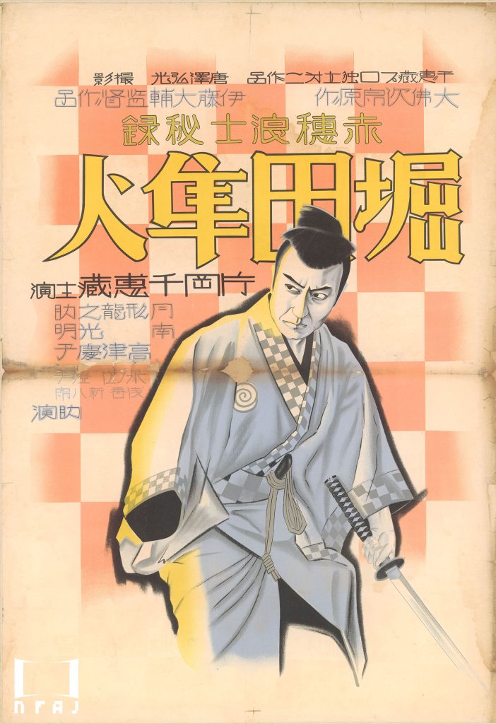 架空のキャラクター堀田隼人を主人公にした大佛次郎「赤穂浪士」を伊藤大輔が翻案・演出。モダンな市松模様を背景に片岡千恵蔵が映える。