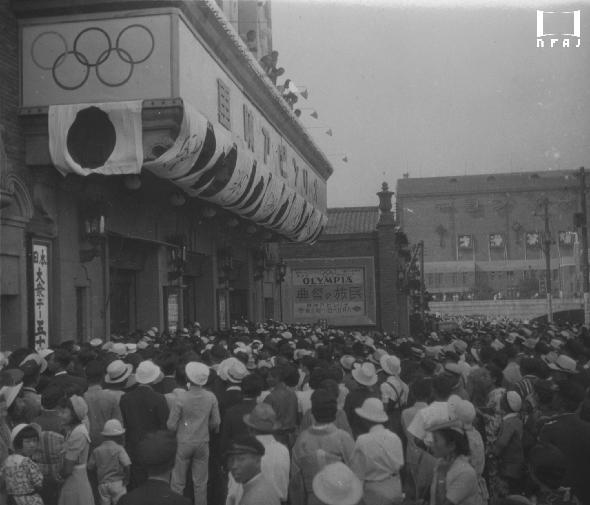 1940年8月に一般公開された五輪記録映画『民族の祭典』(レニ・リーフェンシュタール監督)に押し掛ける観衆。初日の8月29日に限って50銭均一としたため大混雑した。東京劇場(東劇)は1930年4月、歌舞伎などの演劇の劇場として開場した。