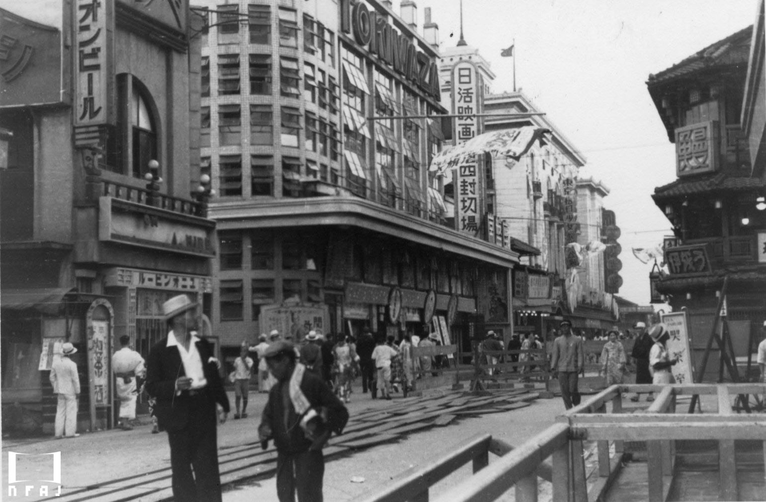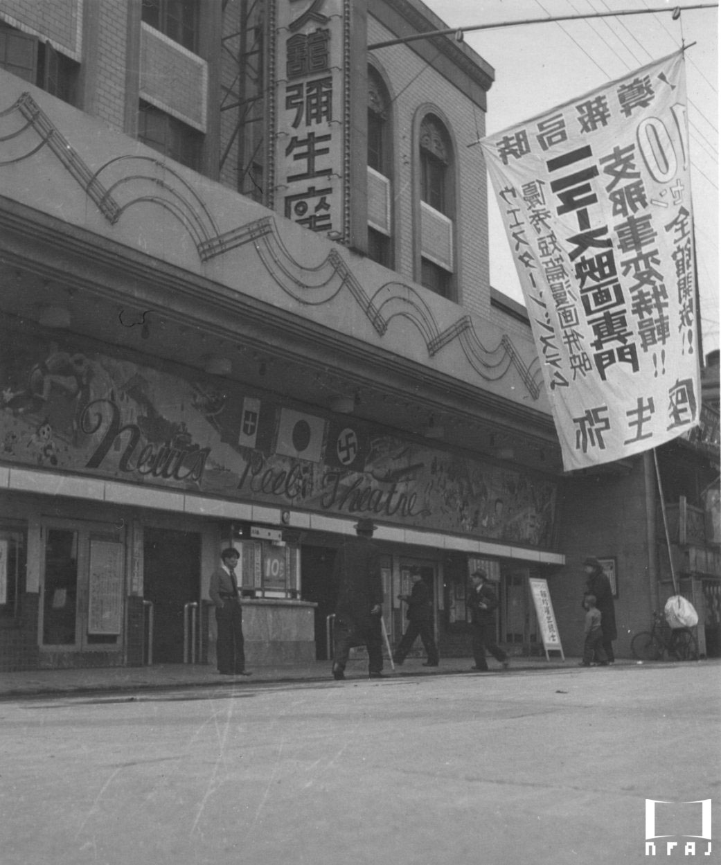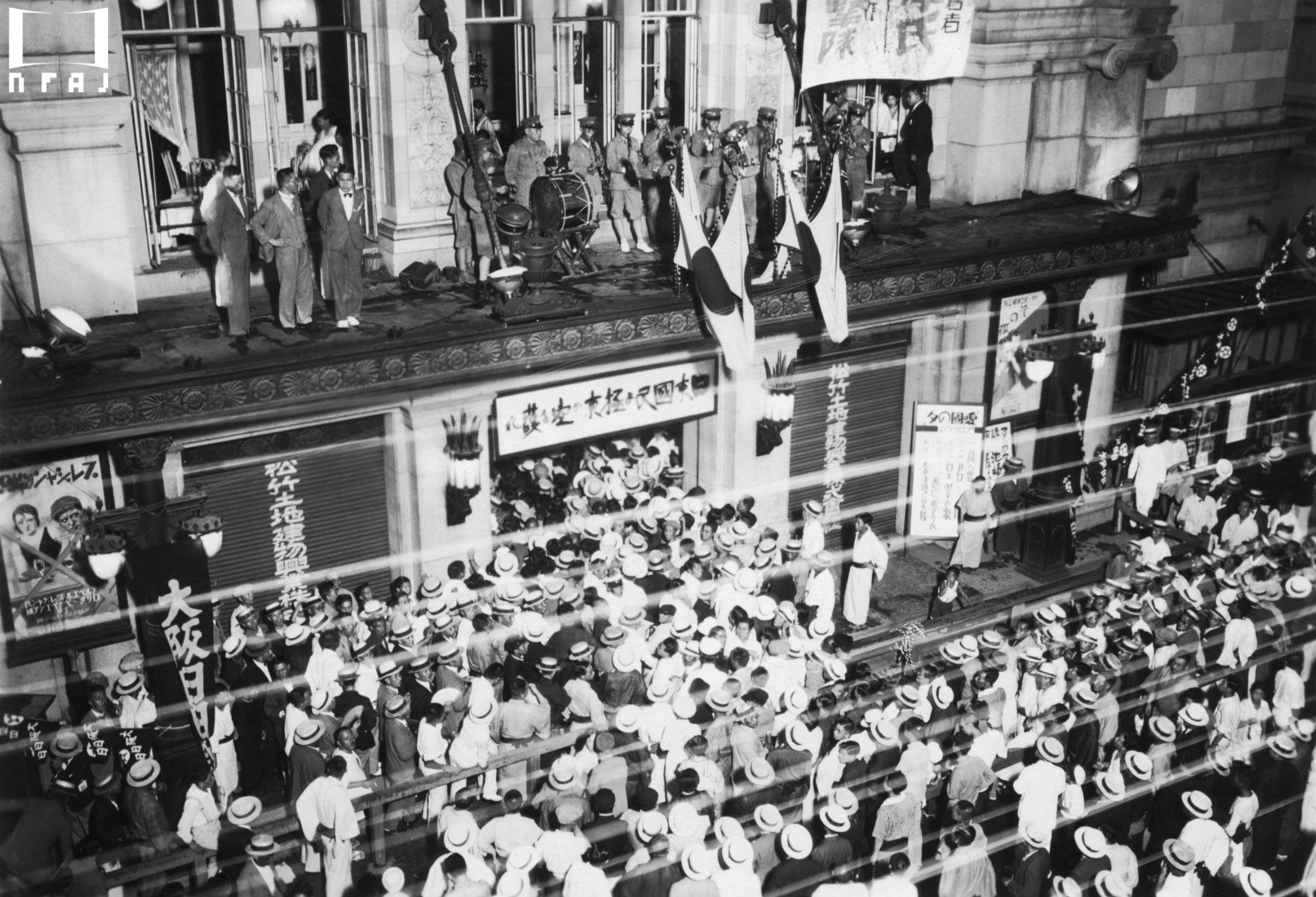 1932年8月26日に開催された「愛国の夕」に詰めかけた人々。この催しはアメリカ海軍飛行隊の威力を見せるアメリカ映画『太平洋爆撃隊』(ジョージ・ヒル監督、1931年)の試写と、それに対して日本の防空思想を説いた軍事評論家池崎忠孝の講演とからなっていた。この時期は、写真からも分かる通り、フランス映画『プレジャンの船唄』 (カルミネ・ガッローネ監督、1931年)とアメリカ映画『その夜』 (フランク・タトル監督、1932年)といった外国映画の封切館だったが、「愛国の夕」の盛況から、満州事変以後、大衆の時局に対する関心の高さが伺える。9月1日に封切られた『太平洋爆撃隊』も興行的に高い成績を収めた。