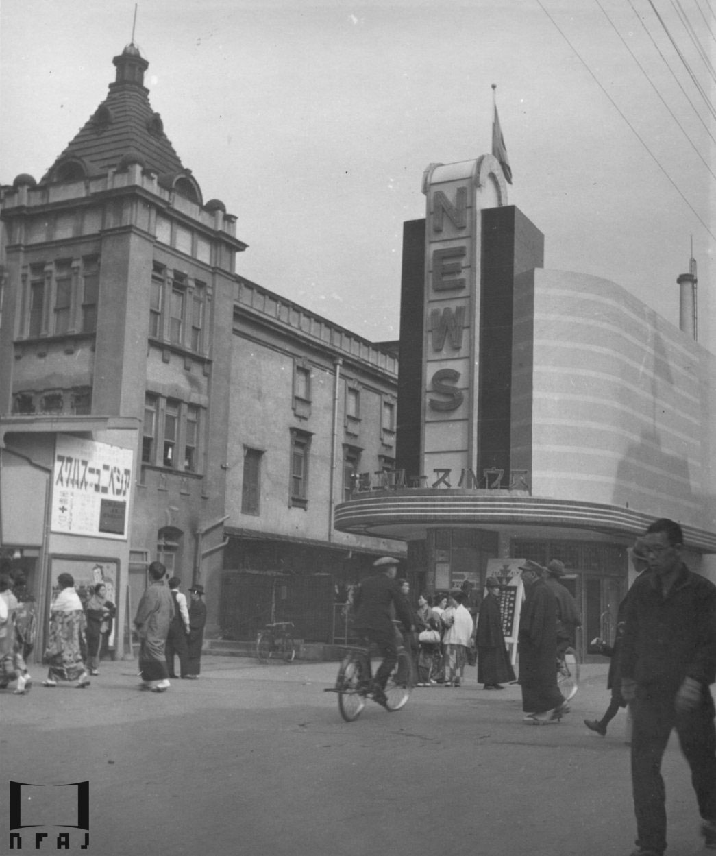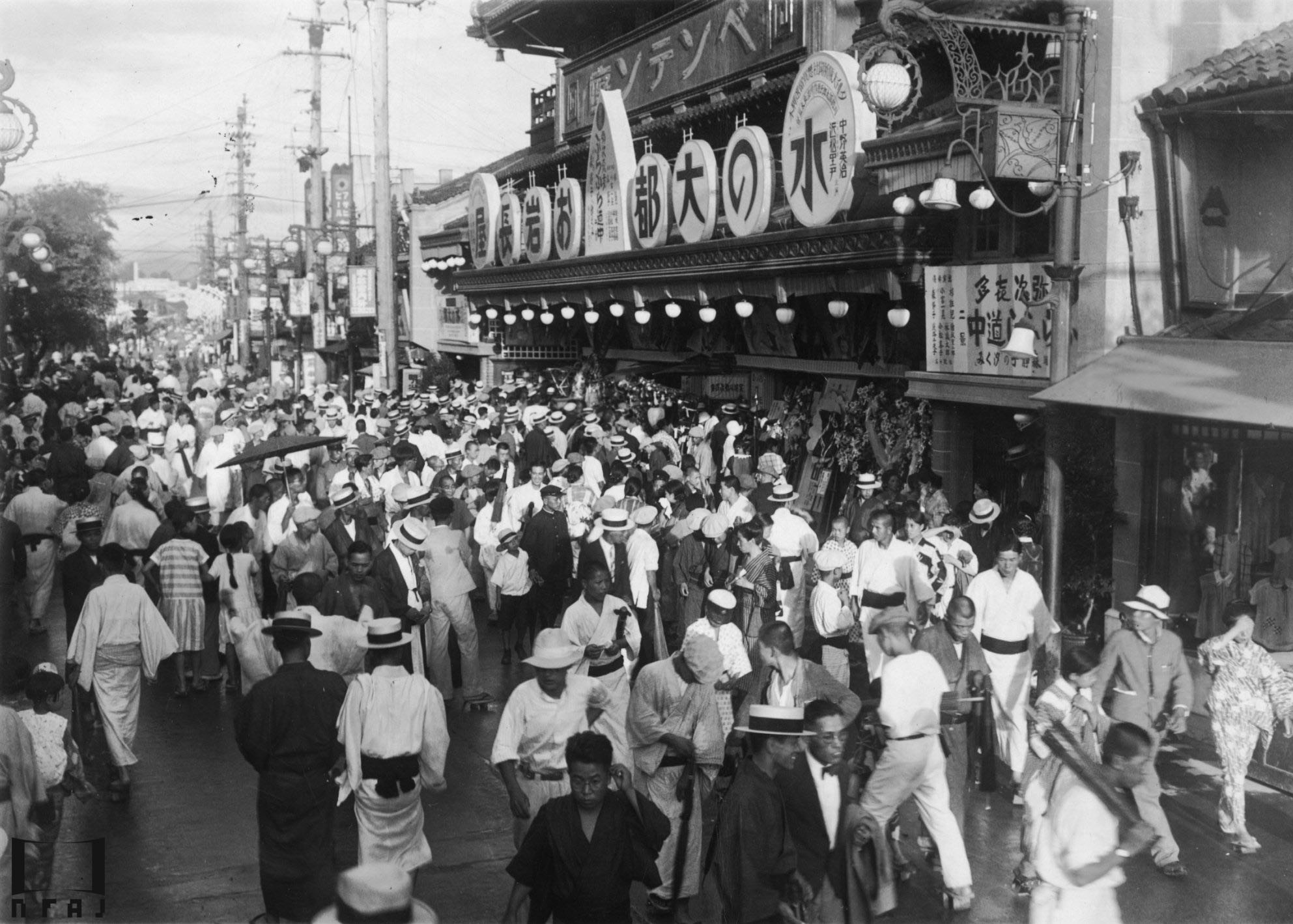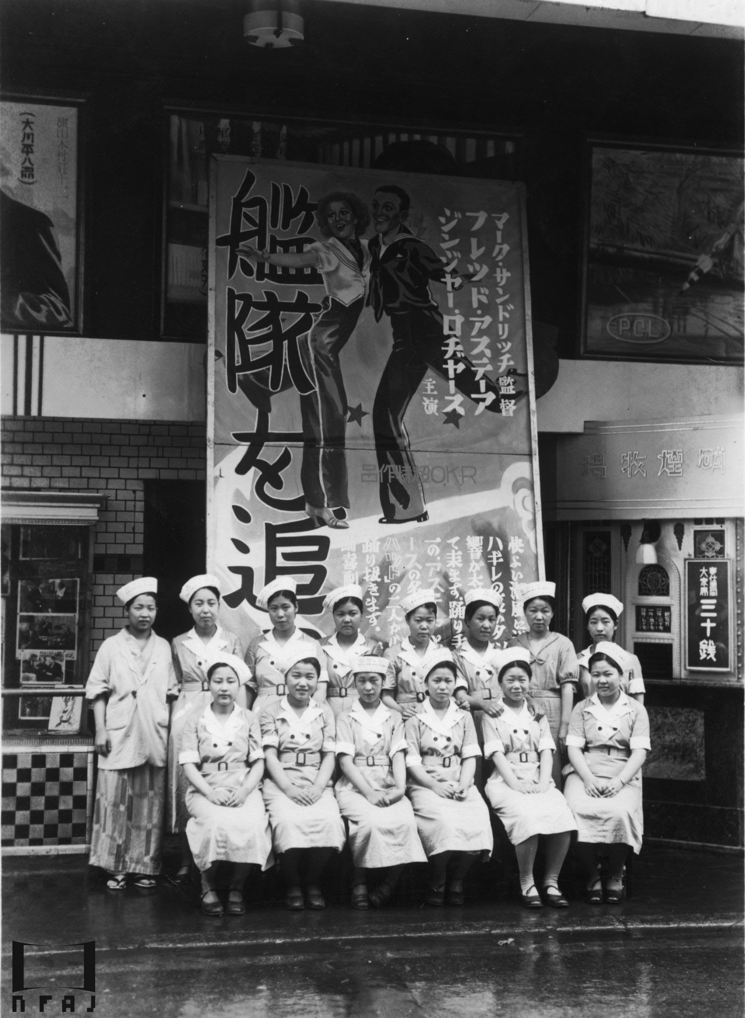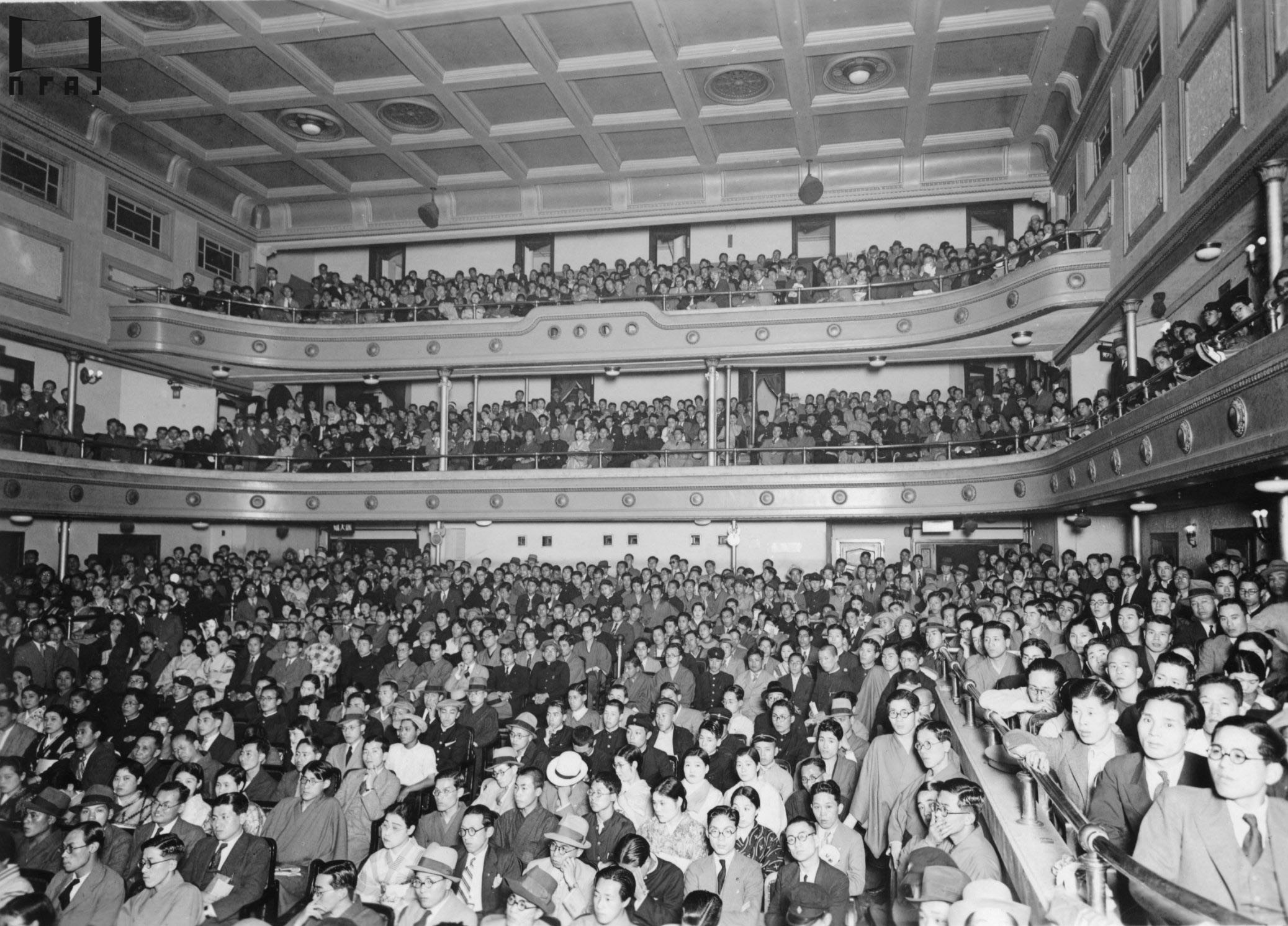 1932年8月26日に開催された「愛国の夕」に詰めかけた人々。この催しはアメリカ海軍飛行隊の威力を見せるアメリカ映画『太平洋爆撃隊』(ジョージ・ヒル監督、1931年)の試写と、それに対して日本の防空思想を説いた軍事評論家池崎忠孝の講演とからなっていた。この時期は、写真からも分かる通り、フランス映画『プレジャンの船唄』 (カルミネ・ガッローネ監督、1931年)とアメリカ映画『その夜』 (フランク・タトル監督、1932年)といった外国映画の封切館だったが、「愛国の夕」の盛況から、満州事変以後、大衆の時局に対する関心の高さが伺える。9月1日に封切られた『太平洋爆撃隊』も興行的に高い成績を収めた。