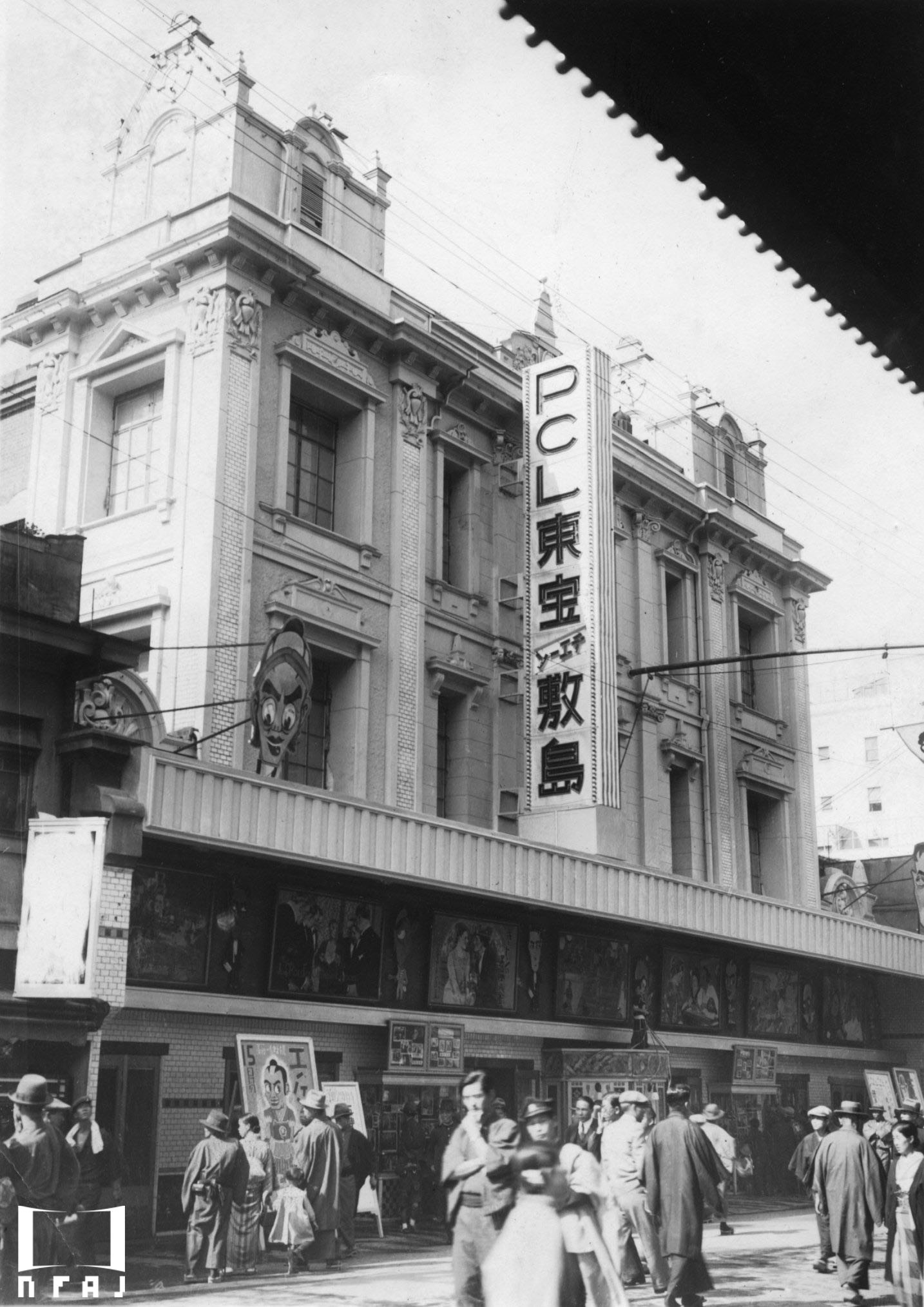 1911年に芝居の劇場として開場した「敷島倶楽部」はその後洋画の封切館となった。掲載写真は1935年10月に東宝チェーンに組み込まれた時のもので、『エノケンの近藤勇』(山本嘉次郎監督、1935年)とフランス映画『キートンの爆弾成金』(マックス・ノセック監督、1934年)の看板や館前装飾が見える。この時期の定員は749名。場所は千日通を隔てた大阪劇場と常盤座の向かい側にあった。のちに「東宝敷島劇場」と名を変え、1956年の改築の際に「敷島シネマ」との2館になるが、1999年に閉館。現在は「TOHOシネマズなんば 別館」となっている。