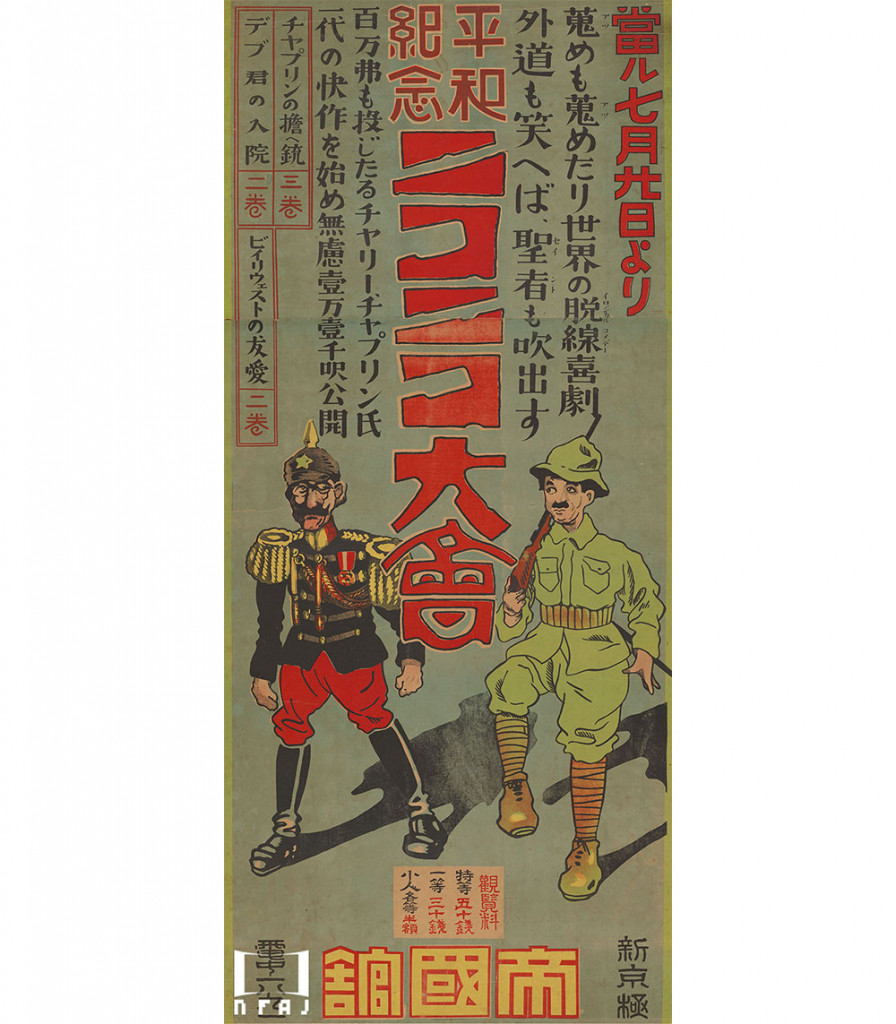 ポスターのタイトルに「平和紀念」とあるのは、世界大戦の終結を祝う意味。併映作はロスコー・アーバックル主演の『デブ君の入院』Good Night Nurse(1918年)と、チャップリンの物真似で名を馳せたビリー・ウェスト主演の『ビリイウェストの友愛/ビリー・ウエストの慈善』His Married Life(1916年)。