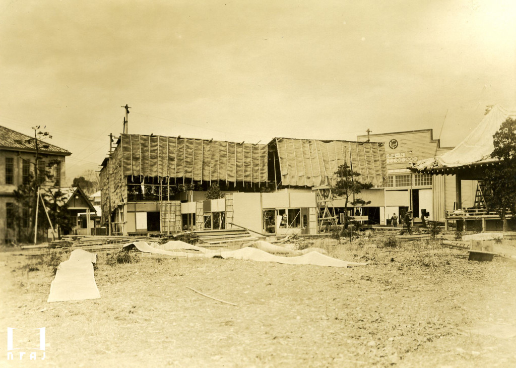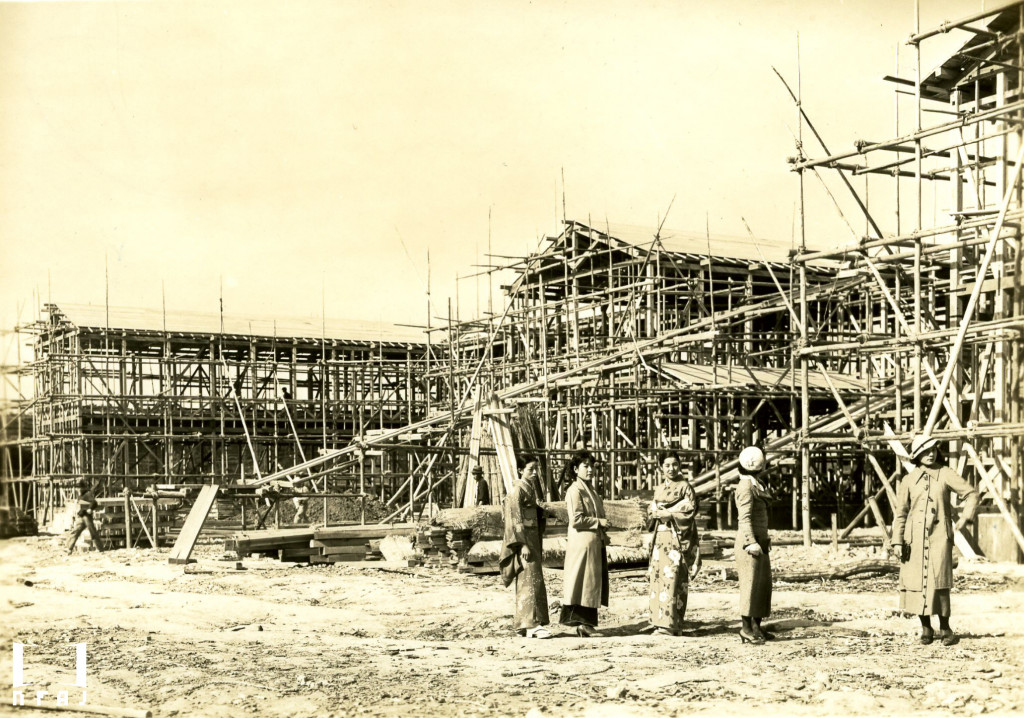 建築中の俳優館を見る女優たち、右端は三宅邦子。