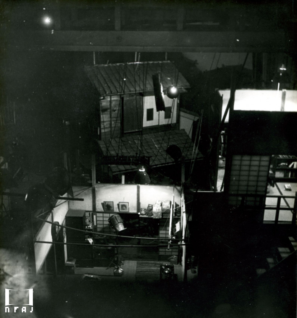 『朧夜の女』(1936年、五所平之助監督)撮影中のセット。
