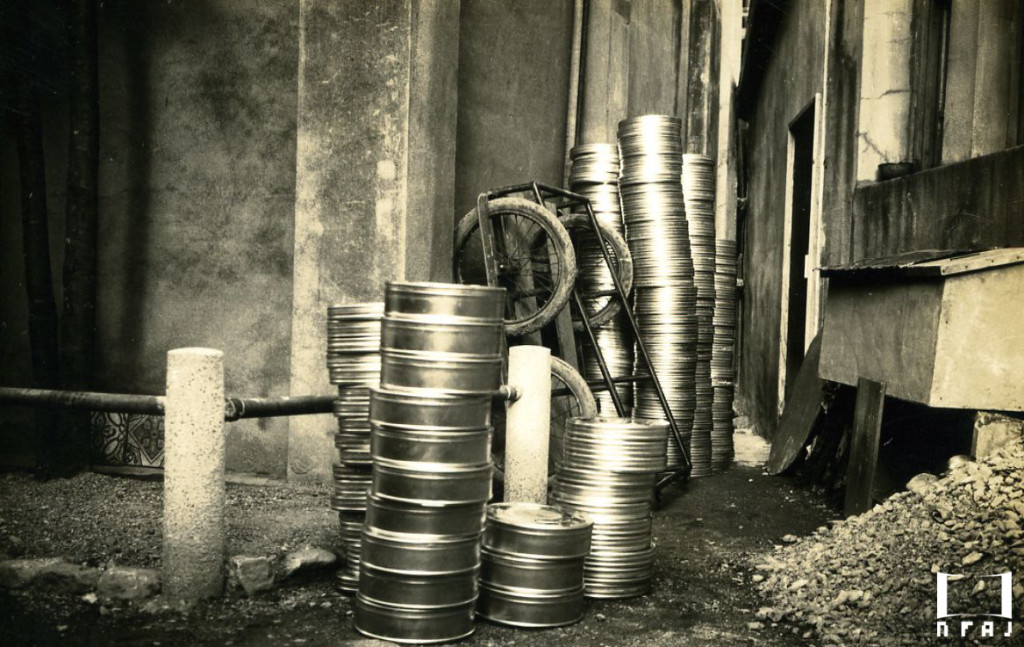フィルム倉庫の前につまれたフィルム缶。