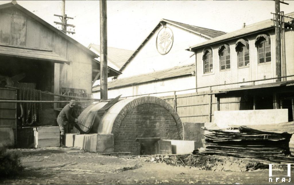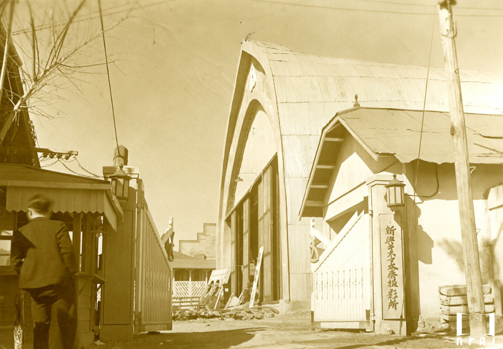 阪東妻三郎プロダクション太秦撮影所(1926年頃)、スタジオの看板には阪妻プロをバックアップした立花良介の一立商店の文字が見える。