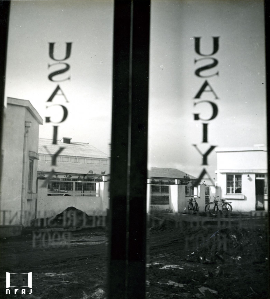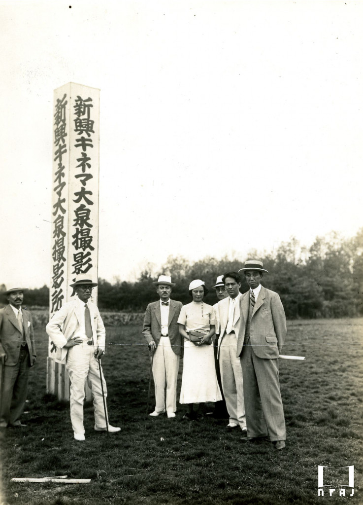 撮影所建設予定地に立つ関係者、右から高橋歳雄(所長)、島耕二(俳優)、岡部龍(宣伝部長)、池雅子(俳優)、吉村百太(支配人)、堤友次郎(副社長)、小林喜三郎。(『キネマ旬報』1934年9月1日・第516号、時報欄掲載)