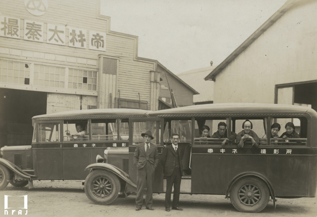 帝キネ太秦撮影所(1930年頃)、2台の大型ロケバス、右から俳優の平塚恭子、月村節子、市川玉太郎、藤間林太郎、歌美陽子、立っているのは総務部長の山崎修一(彼は阪妻プロ時代からの支配人)、中野英治。