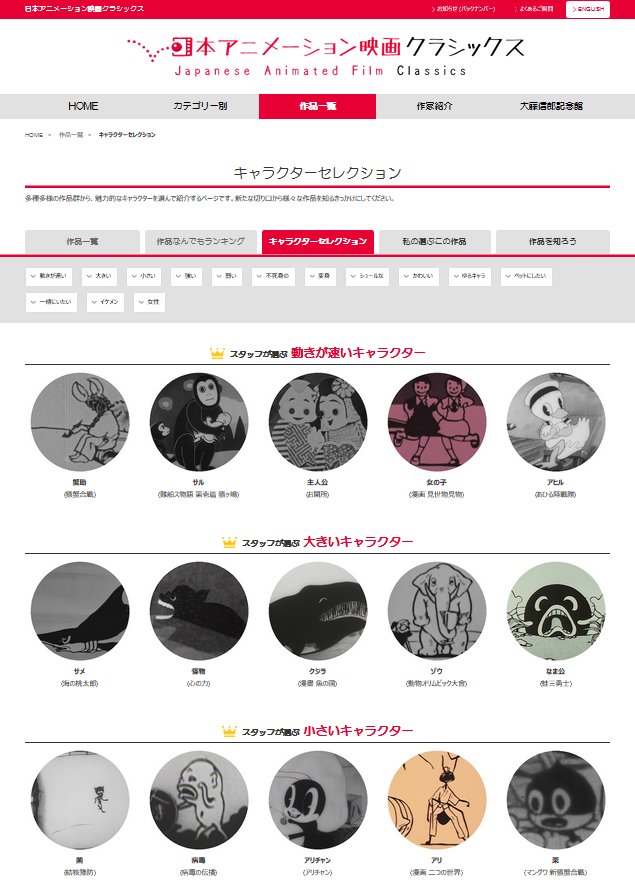 日本のアニメーションの礎となった先駆者たちを紹介。各作家の紹介ページから作品の閲覧も可能。