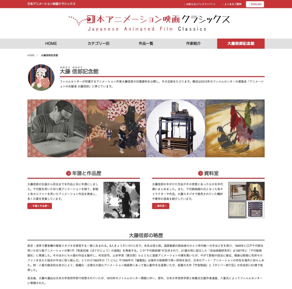フィルムセンター所蔵のフィルムからデジタル化された、1917年から1942年までの日本アニメーション映画64本を公開。また「大藤信郎記念館」ではフィルムセンターが所蔵する「大藤信郎コレクション」の一部が閲覧可能。さらに、現存する日本最古のアニメーション映画『なまくら刀』(1917年幸内純一/別名:塙凹内名刀之巻[はなわへこないめいとうのまき])も閲覧できます。