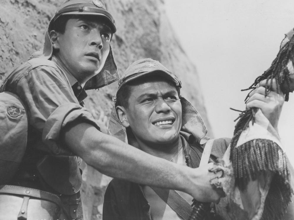 日中戦争における北支戦線の最前線を転戦してきた左文字隊は、消えた軍旗を捜索する任務を命じられる。佐藤は岡本喜八作品の大半を占める32本でコンビを組んだが、その中でも代表的な作品。「独立愚連隊マーチ」の軽快なメロディが反戦映画の諧謔とユーモアを際立たせている。