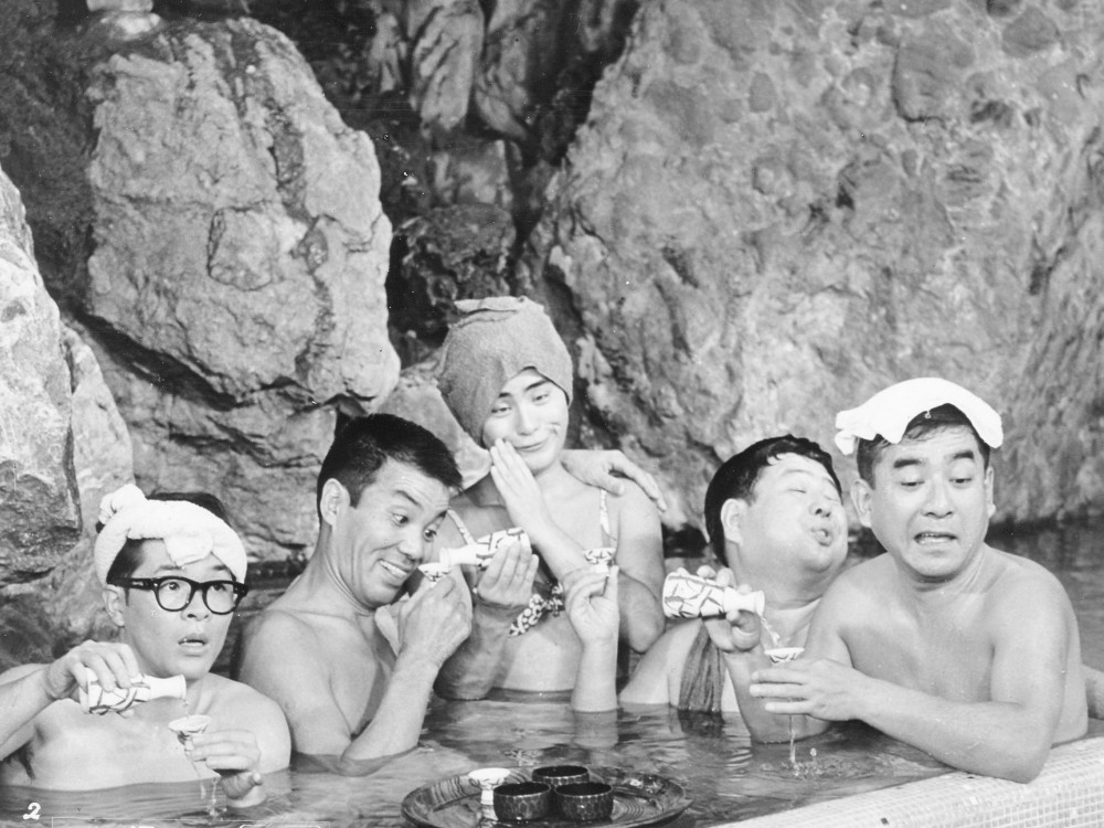 松竹の「全員集合!!」シリーズ(1967-1975)の第3作。洞爺湖温泉を舞台に騒動が繰り広げられ、名曲「いい湯だな」にのせてさまざまな情景での入浴シーンが反復される。東京音楽学校出身の萩原哲晶は、クレージーキャッツと組んだ仕事で功績を上げ、ザ・ドリフターズとの仕事でも活躍した。