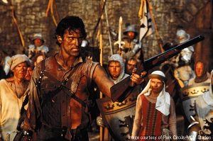 『死霊のはらわた』シリーズの第3作目。スーパーマーケット店員のアッシュ(キャンベル)がタイムスリップした先は、アーサー王(ギルバート)とヘンリー王(グローヴ)が争う中世だった。アッシュは元の時代に戻るために必要な「死者の書」を手に入れる旅に出るが、致命的なミスで死者たちを蘇えらせてしまい、死者の軍隊と人間の戦争を引き起こしてしまう。チェーンソーや銃を駆使したアクション・スプラッター映画とみせかけて、かなりコメディ色の強い一本。